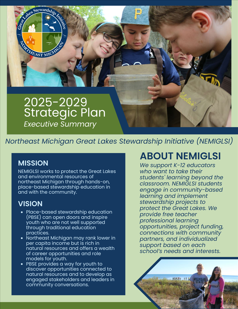 The Northeast Michigan Great Lakes Stewardship Initiative (NEMIGLSI) is a network of education and community partners working to promote quality place-based stewardship education opportunities in Northeast Michigan for the benefit of our youth, our community, and our environment.