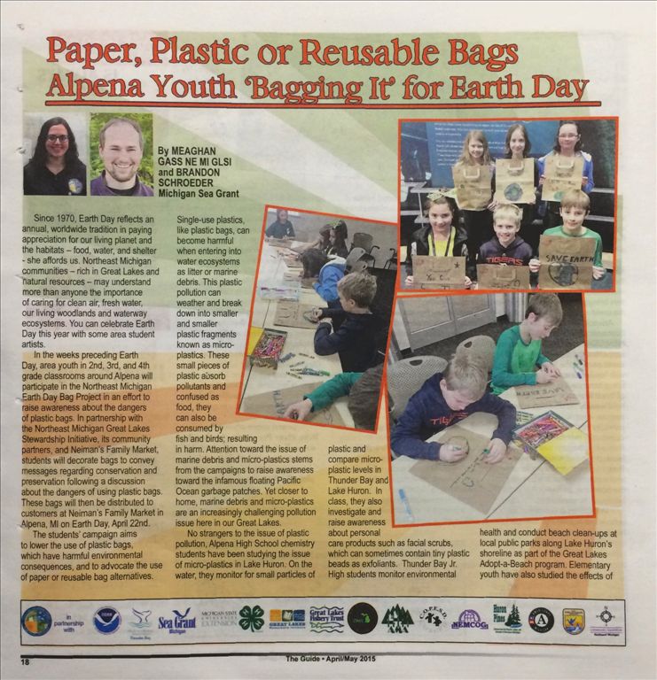 In the weeks preceding Earth Day, area youth in 2nd, 3rd, and 4th grade classrooms around Alpena will participate in the Northeast Michigan Earth Day Bag Project in an effort to raise awareness about the dangers of plastic bags. In partnership with the Northeast Michigan Great Lakes Stewardship Initiative, its community partners, and Neiman’s Family Market, students will decorate bags to convey messages regarding conservation and preservation following a discussion about the dangers of using plastic bags. These bags will then be distributed to customers at Neiman’s Family Market in Alpena, MI on Earth Day, April 22nd.